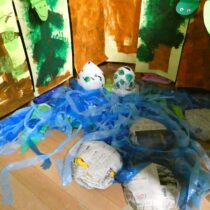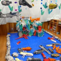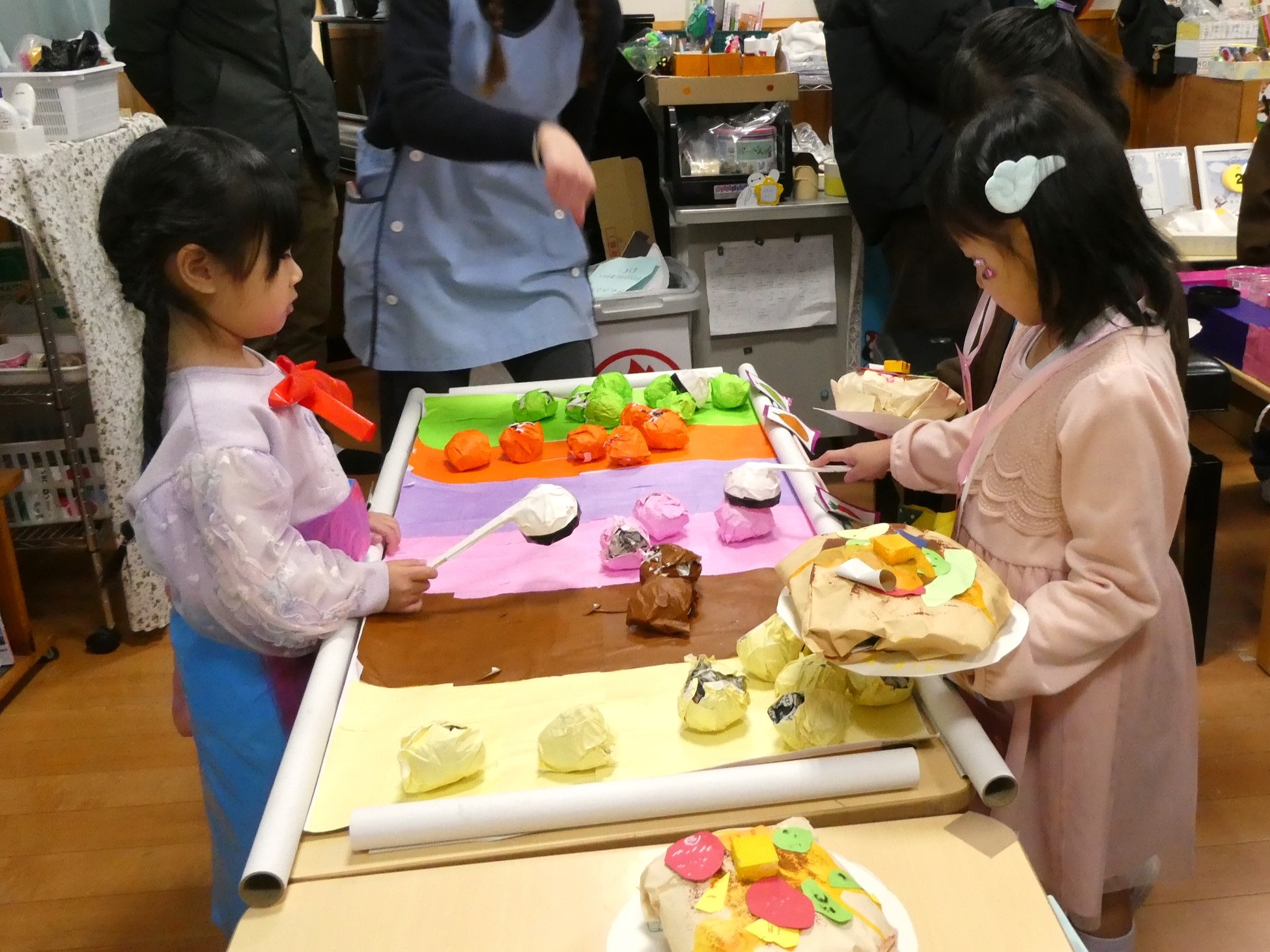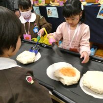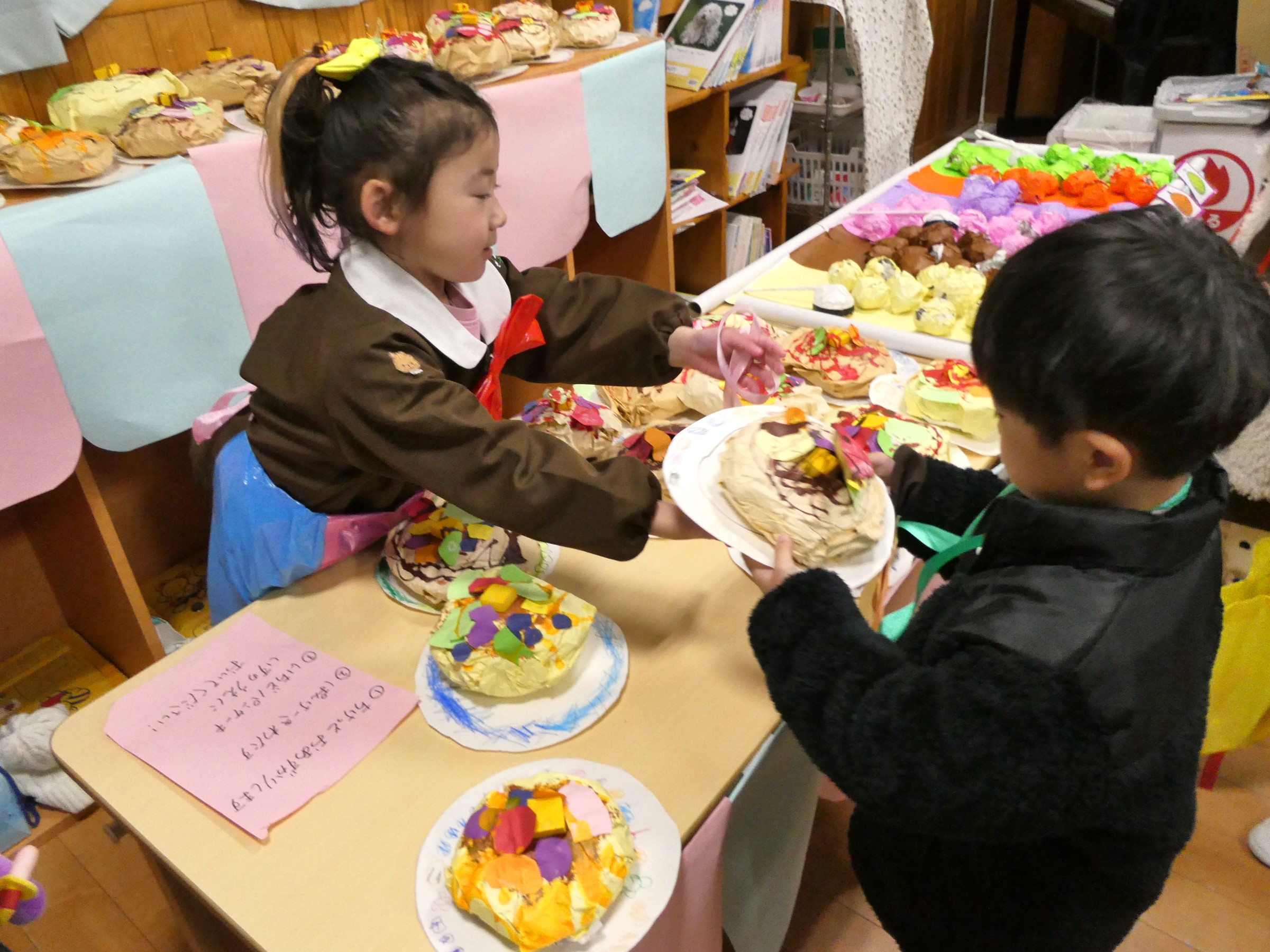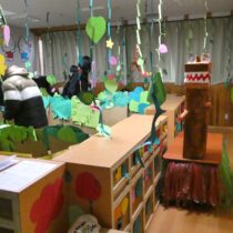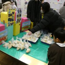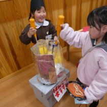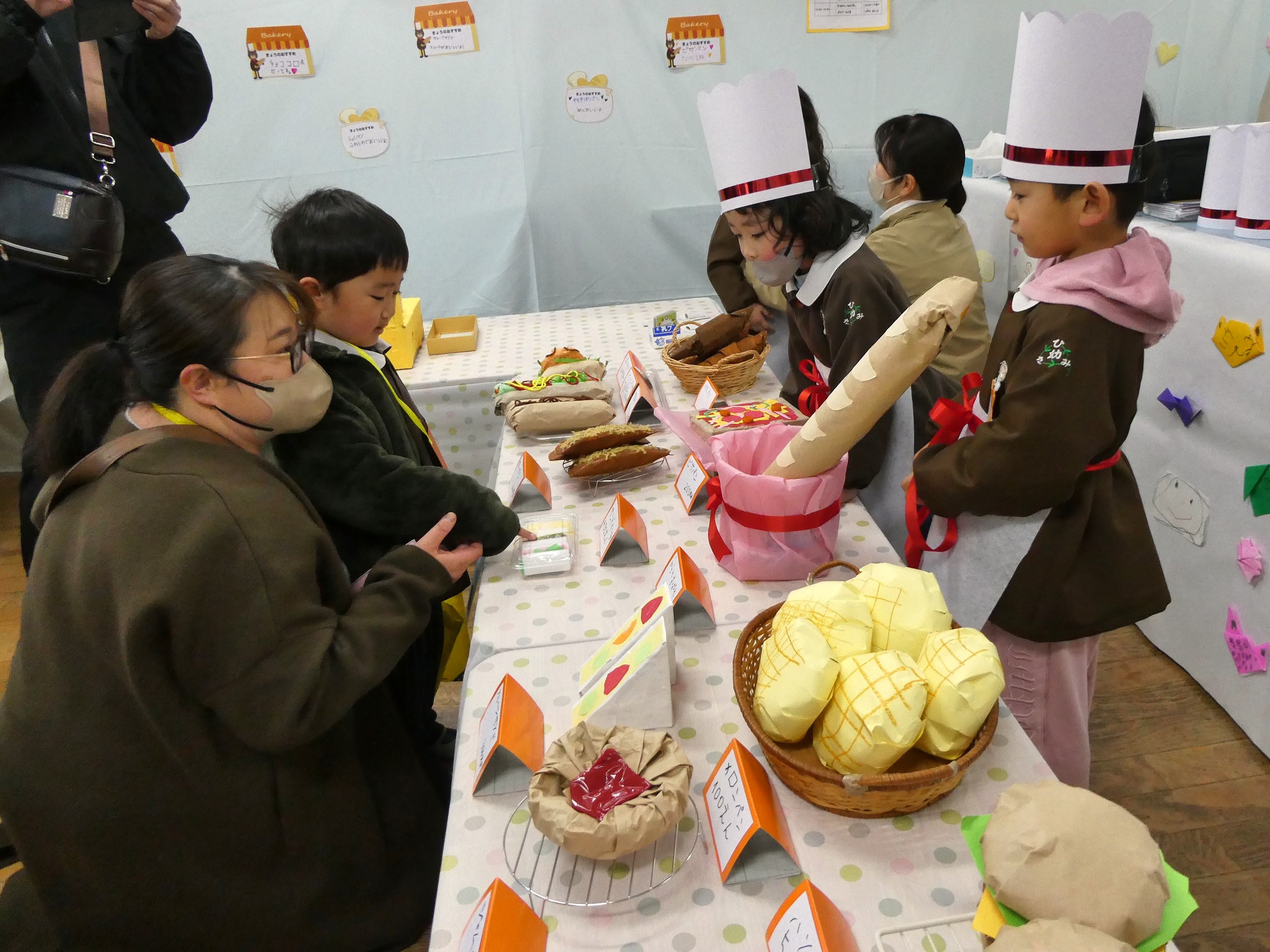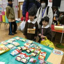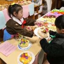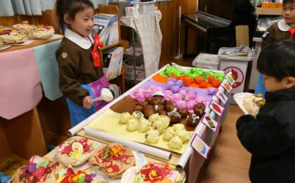 2月7日(土)に『創造展』を行いました。クラスごとに話し合って決めたお店屋さんの品物を作り、作品を売ったり買ったりするお店屋さんごっこ!年中・年長児は「いらっしゃいませ~!」とお店の人になって品物を売ったり、気に入った品物を「これください!」とお買物券で買ったり…やり取りを楽しみながら、様々な作品に触れ合うことができました。また、年長さんのお店は楽しいアイデアが満載!あれもこれも体験したくなって…お買物券が足りないくらいでした!