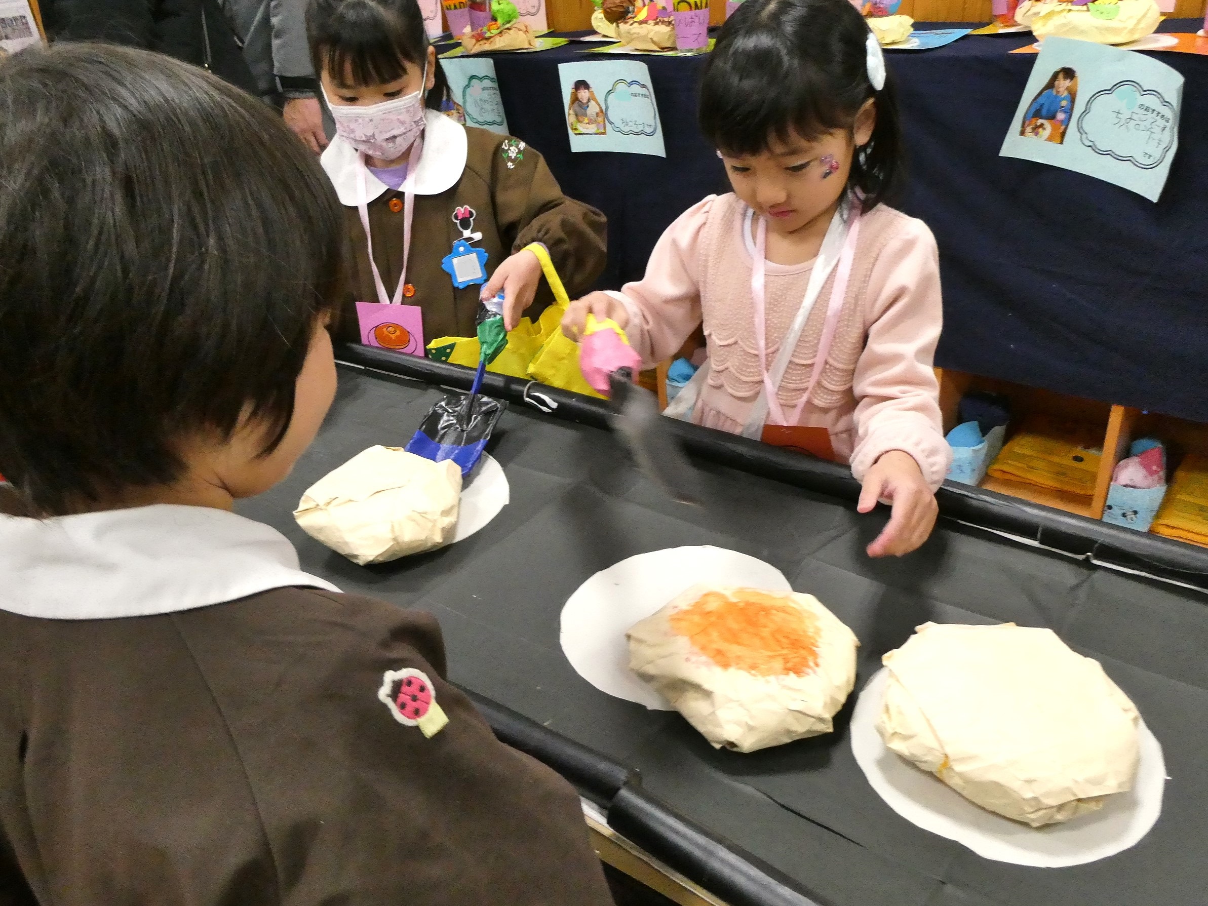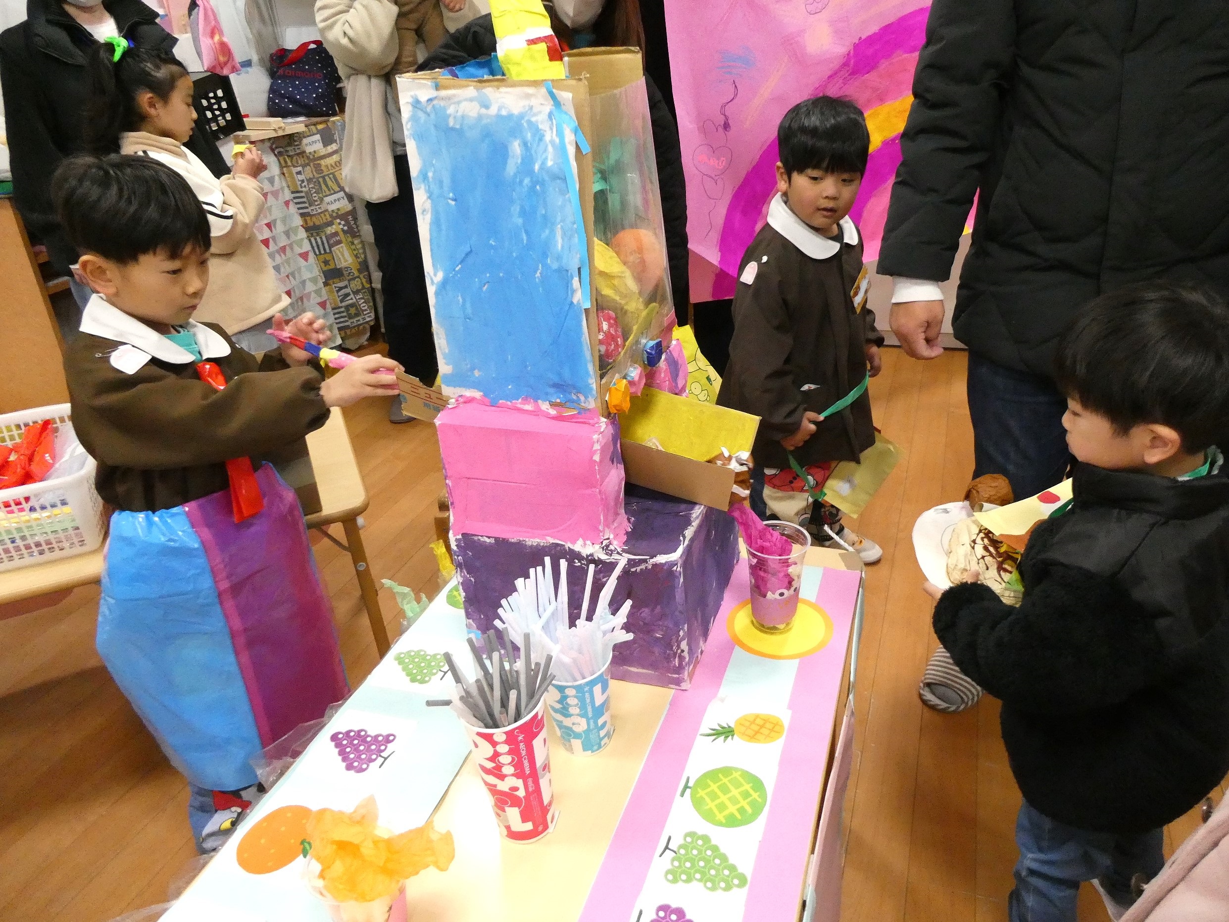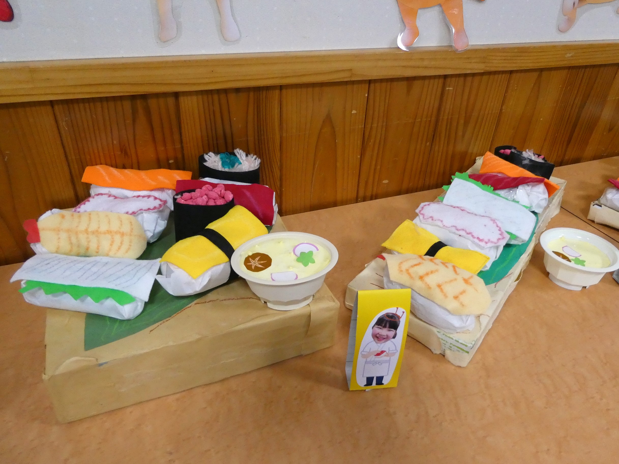 ホールの広い空間を使った年少組。ドーナツやお菓子、クレープ、チョコバナナ、おもちゃなど・・・様々な作品が並びます。