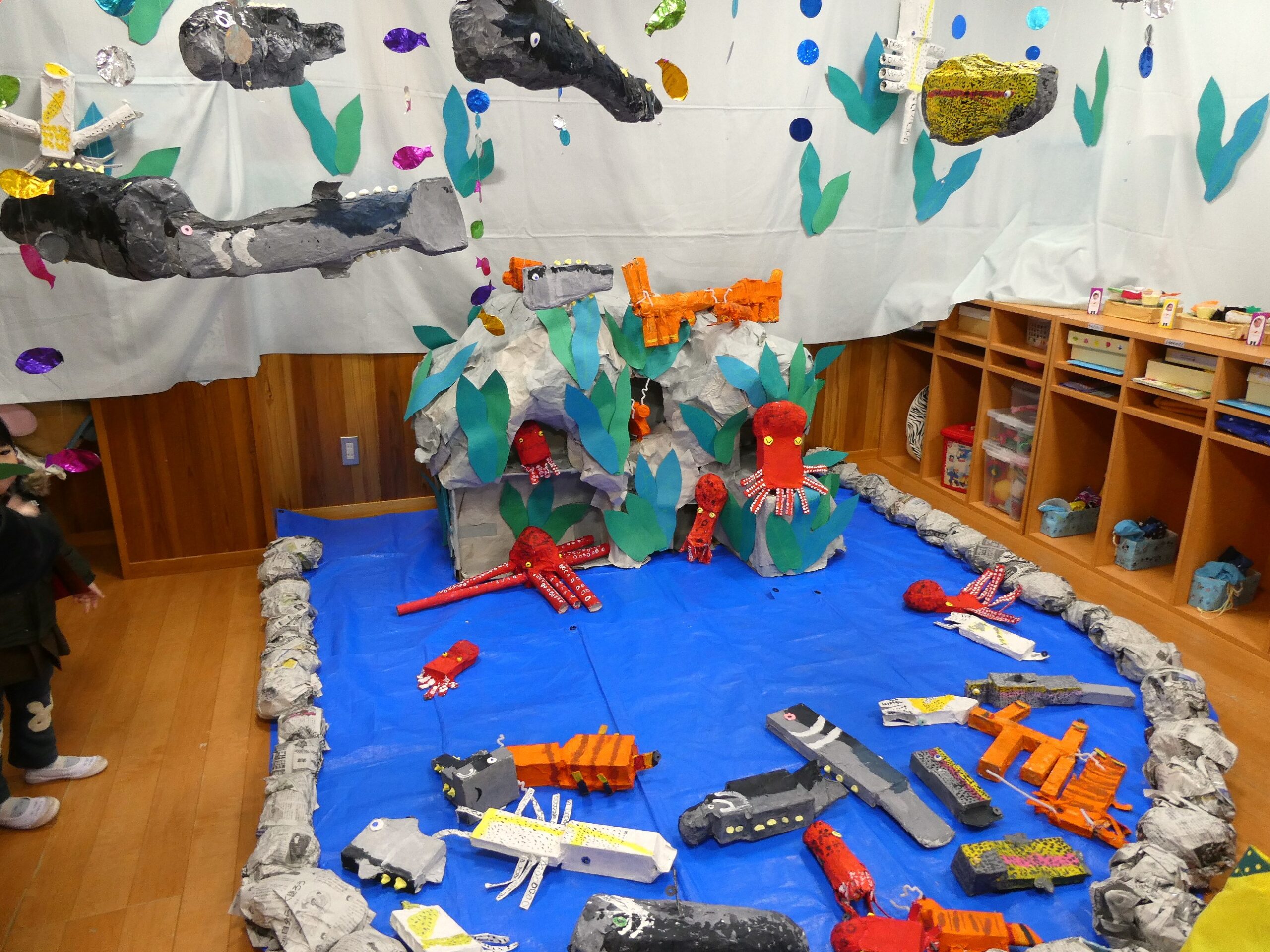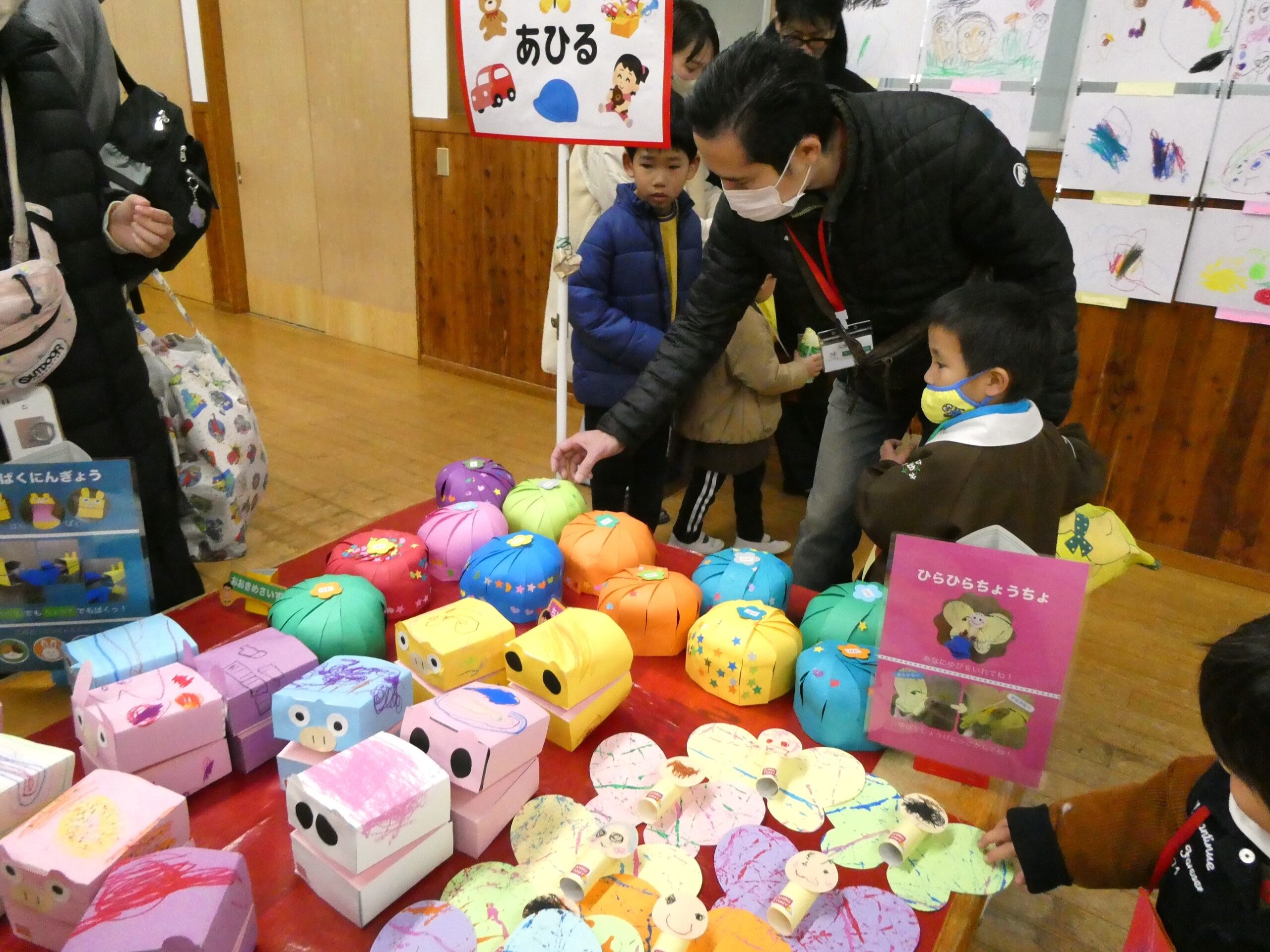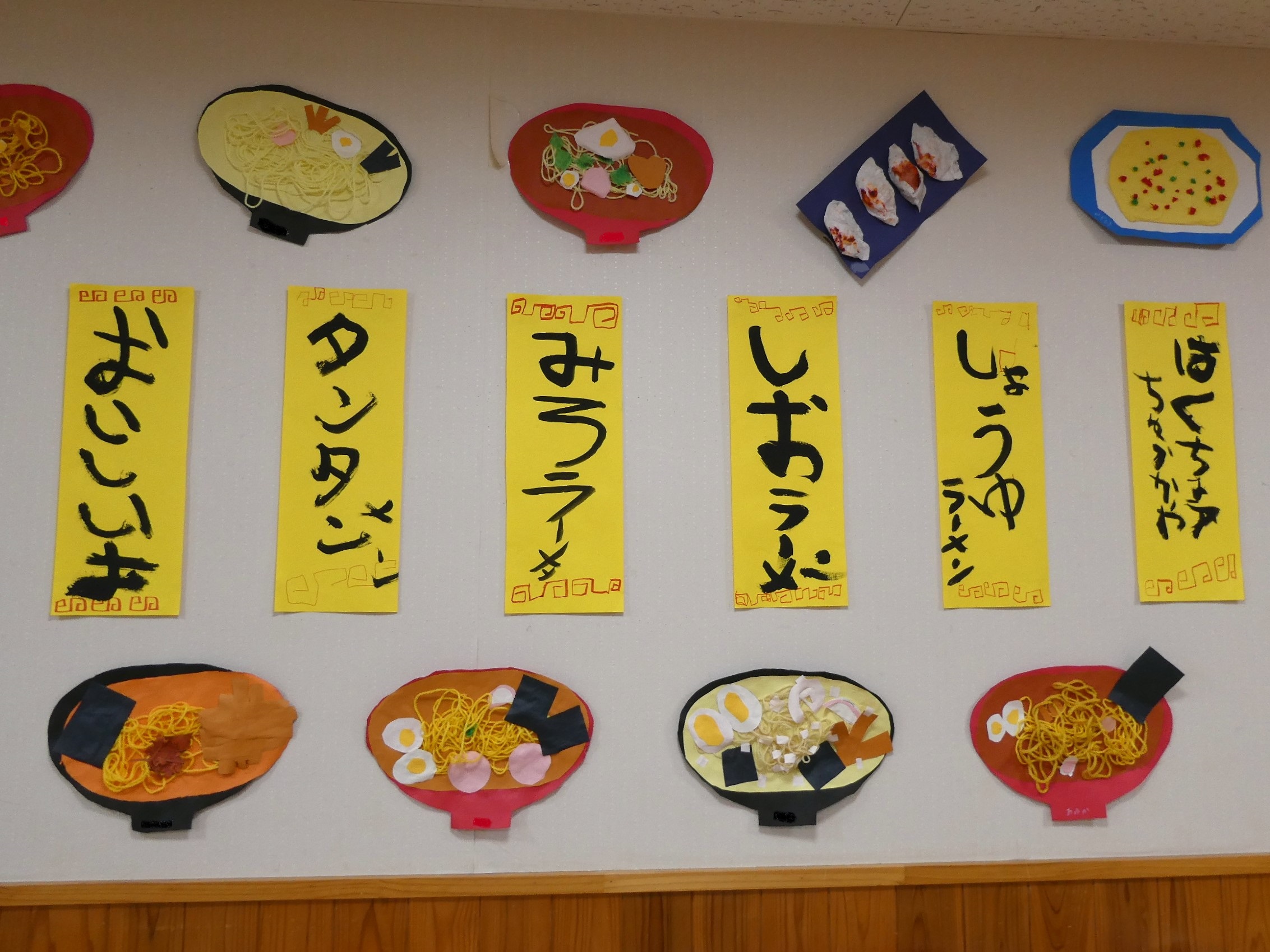ホールの広い空間を使った年少組。ドーナツやお菓子、クレープ、チョコバナナ、おもちゃなど・・・様々な作品が並びます。