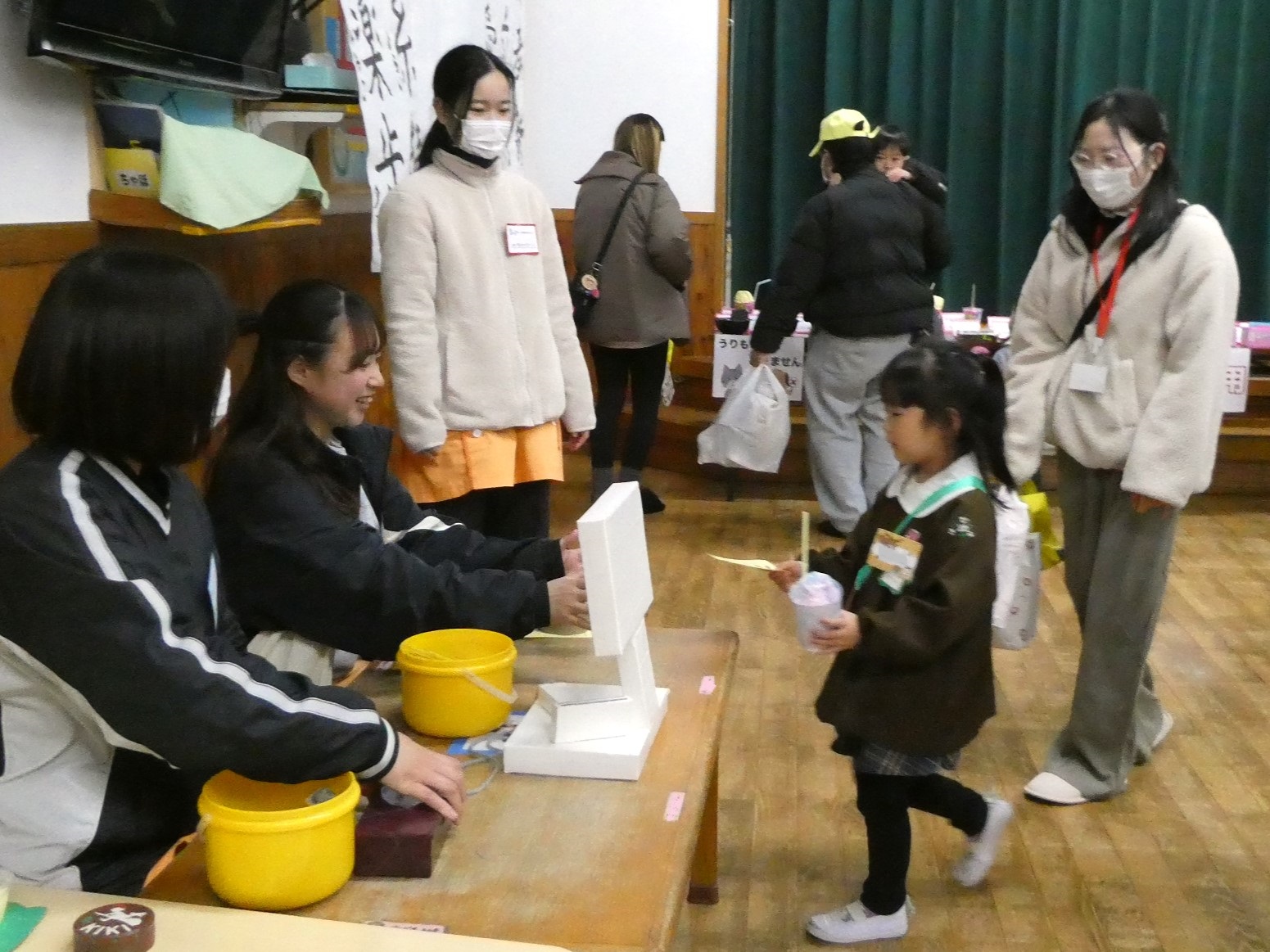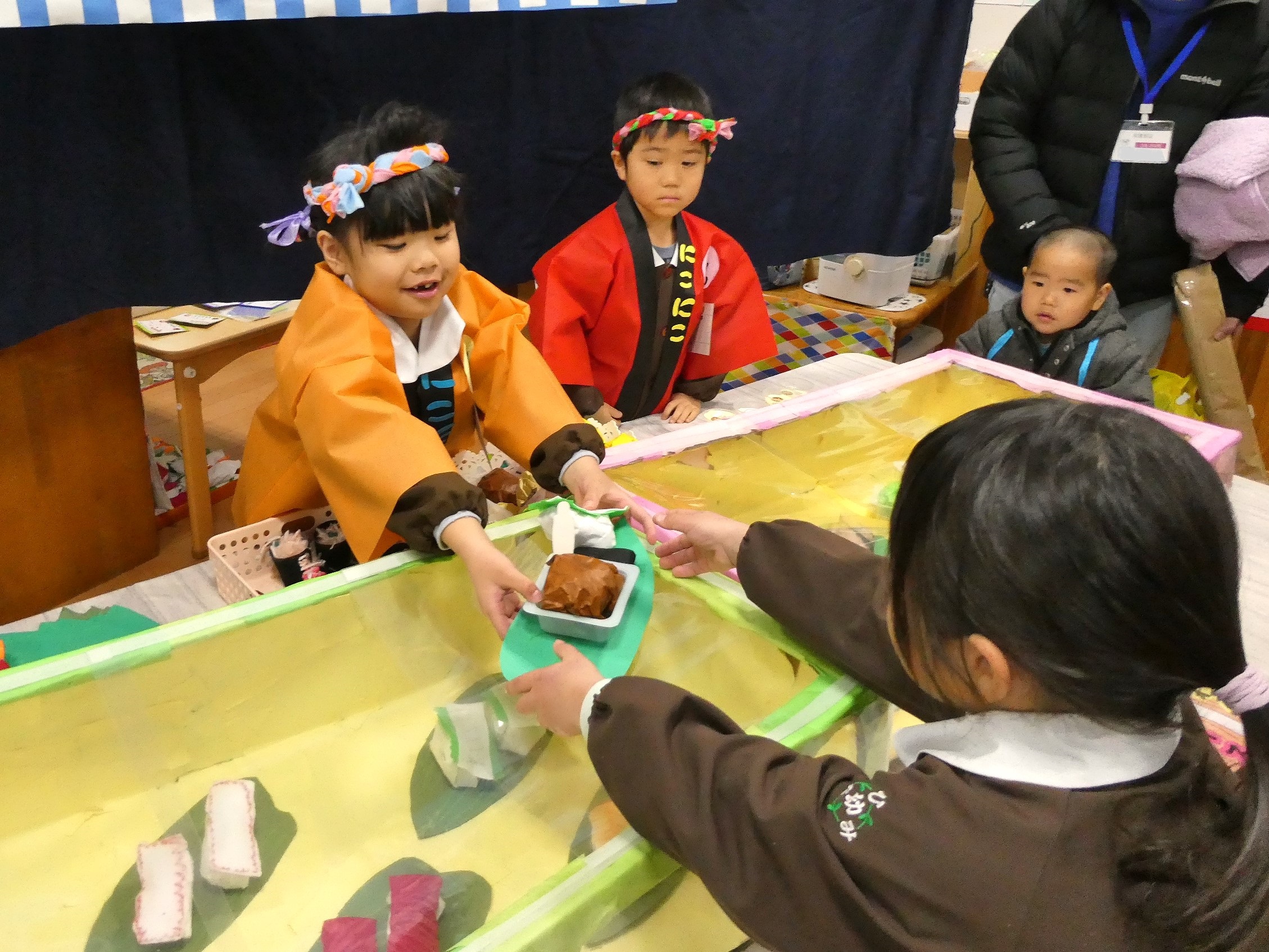 年少組のお会計は先生方が担当します。子ども達は少し緊張した表情で、レジの先生にお買物券を渡していました。