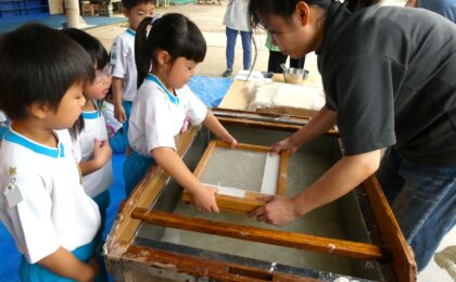 9月4日(木)年長児が和紙すきを体験しました。子ども達は一人ひとり丁寧に教えていただきながら手を動かし、和紙を手作り!完成した和紙は、来年3月に卒園するときに卒園証書となり、手渡される予定です。