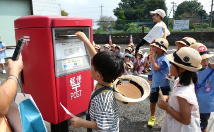 敬老の日を前に、おじいちゃんおばあちゃんに手紙を送りました。年少、年中児はクレヨンで思い思いの絵を描き、年長児はひらがなでメッセージを書いた手紙を、お家から持ってきていただいた封筒に入れてポストへ。子ども達は、おじいちゃんおばあちゃんを思い浮かべて、「夏休みに遊びに行ったんだよ!」「お泊りしたんだ!」と嬉しそうに話していました。