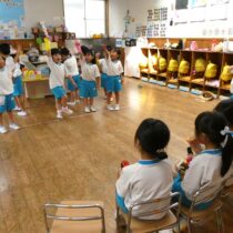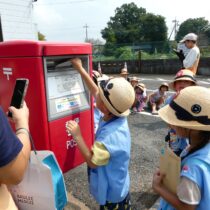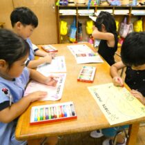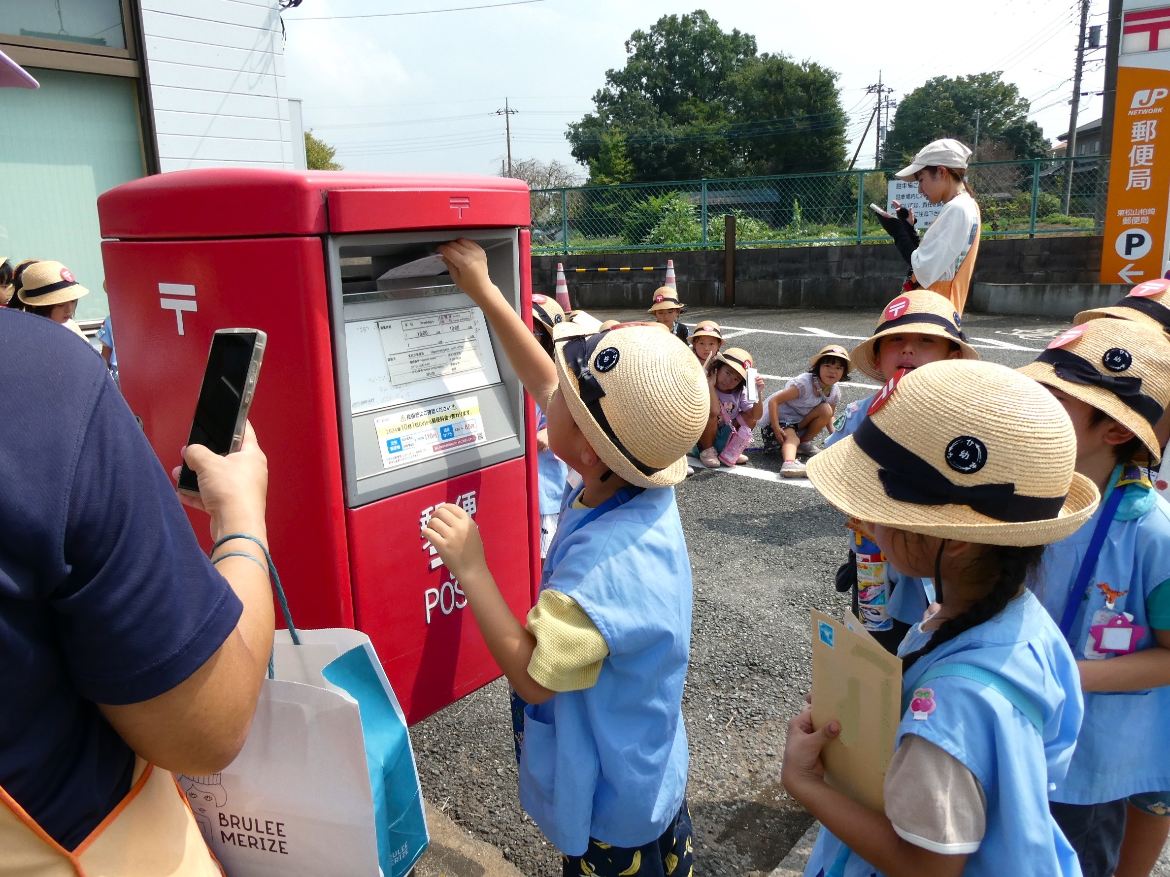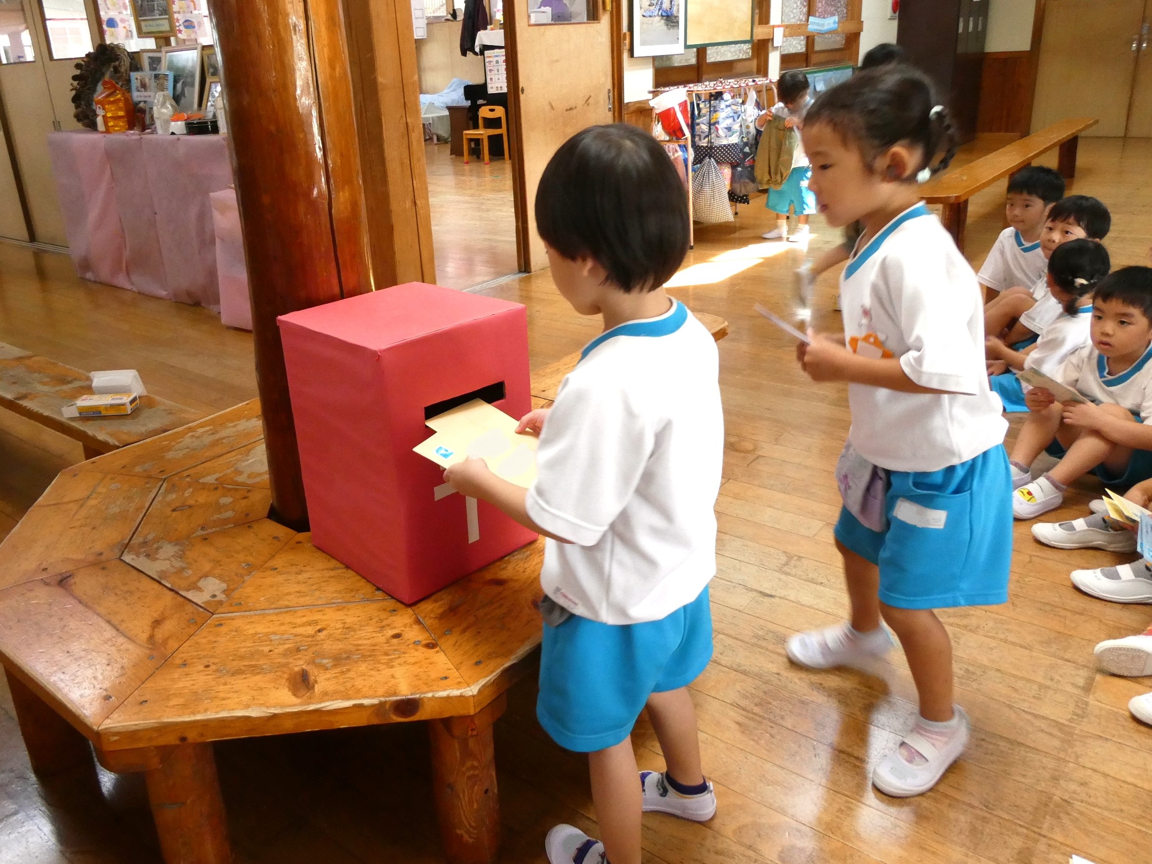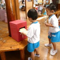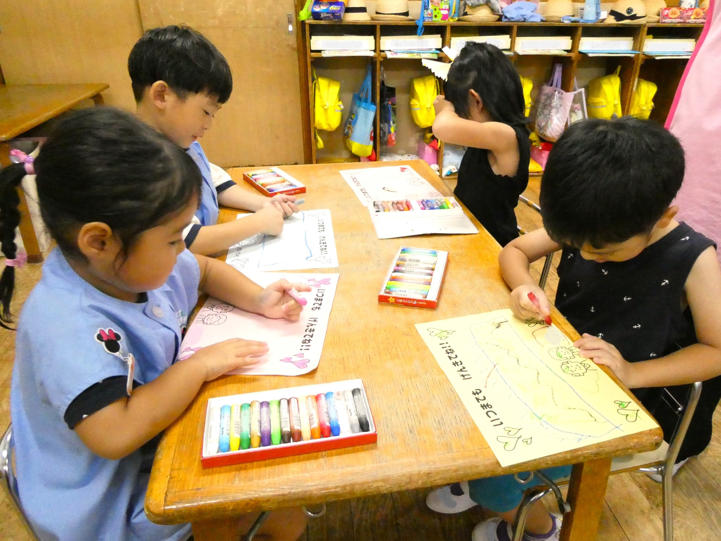 敬老の日を前に、おじいちゃんおばあちゃんに手紙を送りました。年少、年中児はクレヨンで思い思いの絵を描き、年長児はひらがなでメッセージを書いた手紙を、お家から持ってきていただいた封筒に入れてポストへ。子ども達は、おじいちゃんおばあちゃんを思い浮かべて、「夏休みに遊びに行ったんだよ!」「お泊りしたんだ!」と嬉しそうに話していました。
